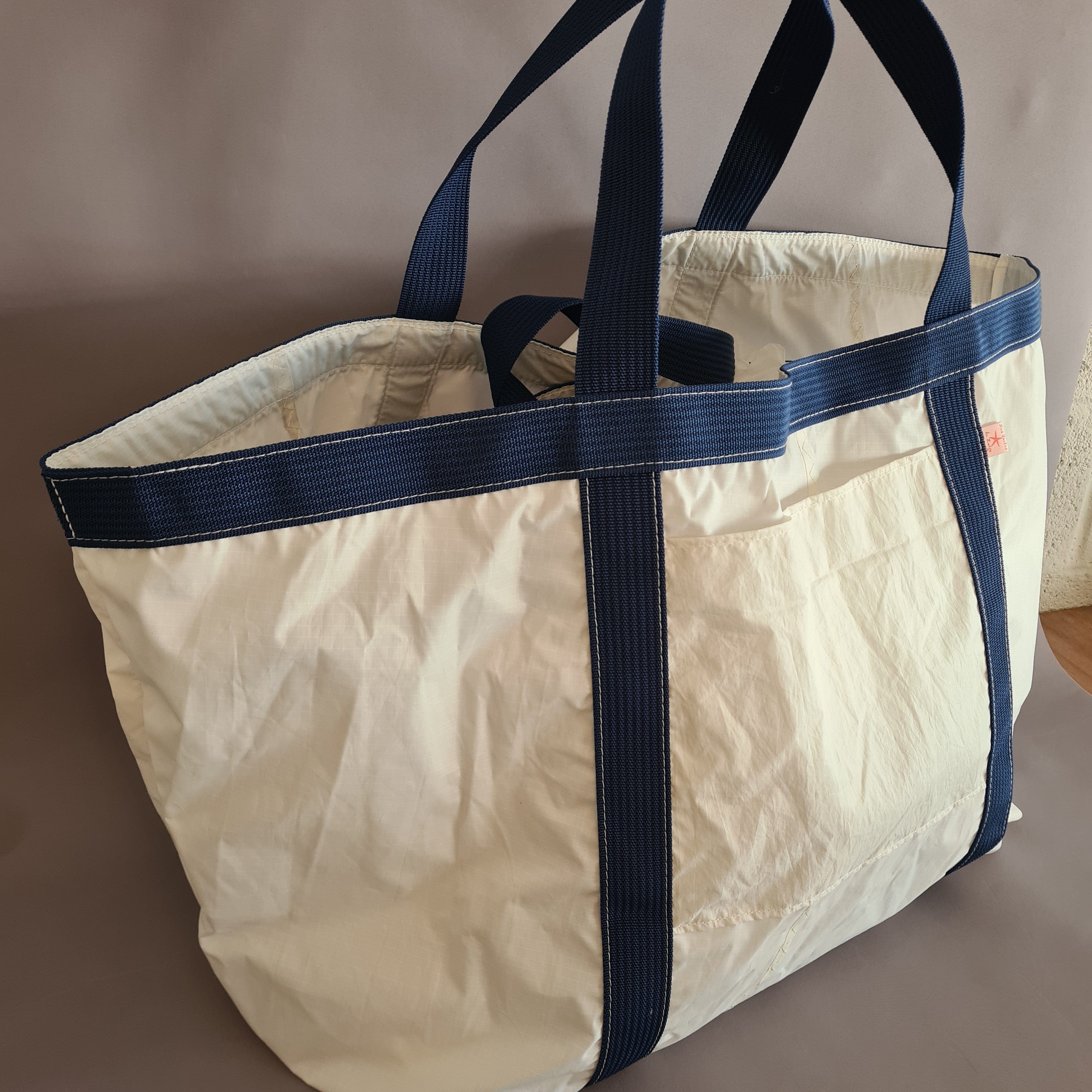 Una tote bag molto grande, ancora più spaziosa, realizzata in spinnaker doppiato (una vela forte, elastica e sottile).